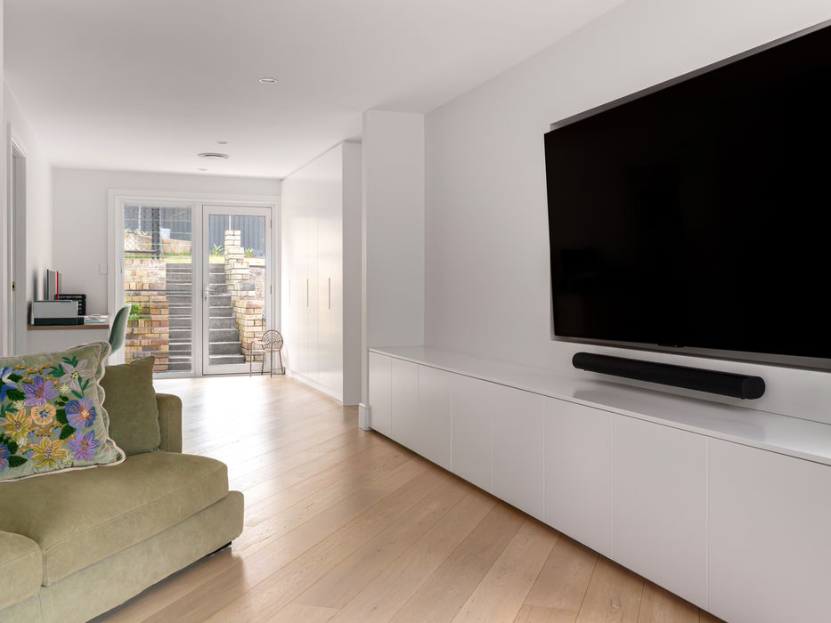 This stunning five-bedroom family home captures a modern coastal interior style that feels fresh, minimal, and effortlessly relaxed. Designed with a growing family in mind, it features dedicated children’s areas, a practical home office, custom mudroom, and smart TV cabinetry for extra storage. V-groove shaker cabinetry and rattan textures pair beautifully with a soft neutral palette to create a laid-back coastal vibe throughout. The kitchen’s curved end with V-groove panel doors and Taj Mahal quartz stone benchtop sits elegantly against warm engineered timber flooring. A striking glass floor reveals the underground cellar beneath the home bar, adding a unique feature for entertaining. Thoughtful details like custom wardrobes and bathroom vanities complete each space, while natural elements and breezy finishes bring a timeless, light-filled coastal retreat house feel to this beautiful family home.